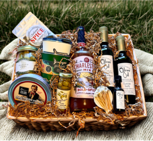 Description: Wicker basket filled with lowcountry delights: Charleston Bold and Spicy Bloody Mary Mix, Bruce Julian Southern Mojo Bloody Mary Rimmer, Lowcountry Produce Pickled Okra, Charleston Spice Company Mediterranean Oil Blend, Lowcountry Olive Oil Tuscan Herb, Lowcountry Olive Oil-Blood Orange, Lowcountry Olive Oil-Fig, two Pirani insulated tumblers with lids