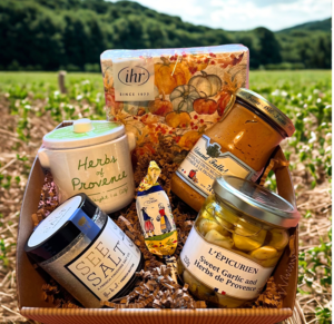 Description: A taste of France Gift basket from Coastal Cupboard includes: See Salt French Butter, Sweet Garlic in Herbs de Provence, Aux Anystetiers du Roy Herbs de Provence spice jar, Edmond Fallot Provencale Dijon Mustard, Fap Quimper Bonbon