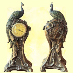 Description: Peacock clock. 14.5 inches tall, 6 inches wide. Requires a watch-type battery. Beautiful table or mantel piece.
