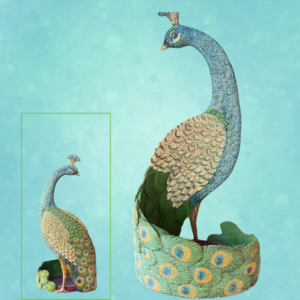 Description: Vibrant peacock candle holder. Beautiful piece for mantel! 12.5 inches tall by 6 inches wide.