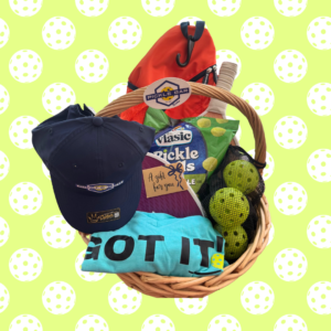 Description: Basket of pickleball goodies includes 2 Friday paddles, Picklebar gift card for one hour of play, t-shirt (L), XL pickleball bag, Picklebar hat, Vlasic pickle balls, Picklebar sticker.
